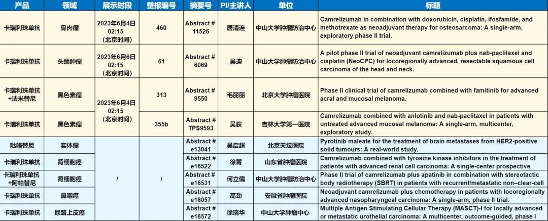 此外,在头颈肿瘤、黑色素瘤、骨肉瘤、鼻咽癌、肾细胞癌、尿路上皮癌等多个领域,卡瑞利珠单抗、吡咯替尼等产品相关研究一共入选了4项壁报展示和5项线上发表,彰显了918博天堂医药强大的自主研发综合实力。
