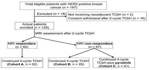 NeoPaTHer研究是一项多中心、前瞻性、非随机的二期临床研究,入组标准为肿瘤直径≥2cm、伴或不伴淋巴结转移、尚未发生远处转移的HER2阳性乳腺癌患者。患者首先接受多西他赛、卡铂联合曲妥珠单抗治疗2个周期,随后进行MRI检查。根据RECIST 1.1标准,若病灶最大直径缩小至少30%,则认为治疗有效,继续原方案治疗4个周期(A组);若无效,则根据患者意愿分为两组:B组继续原方案治疗4个周期,C组在原方案基础上联合吡咯替尼治疗4个周期。研究的主要终点为乳房肿瘤和腋窝淋巴结的tpCR率。研究原计划B组和C组的样本量分别为32例和63例(1:2)。